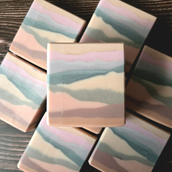 Inspired by the stunning desert sky when the sun is just about to rise, this gently exfoliating oatmeal soap bar is scented with unisex-leaning toward masculine notes of bright mandarin, herbaceous rosemary and exotic saffron, along with creamy coconut, warm tonka bean, and a whisper of musk.