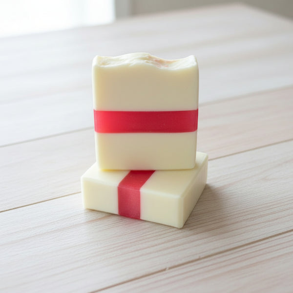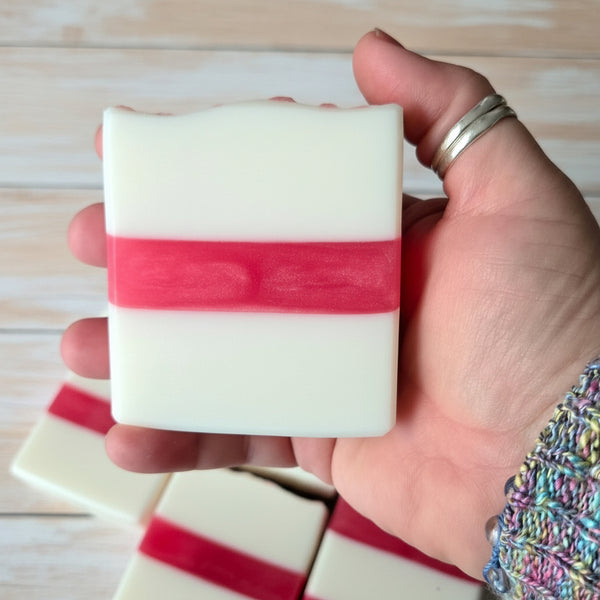 This pretty white and pink handcrafted soap bar combines a whimsical medley of sweet berries, delicate florals, and spun sugar that'll make your shower feel like a treat. Packed with nourishing shea butter and soothing aloe vera, it cleanses without stripping, leaving your skin irresistibly soft. Free from harsh detergents and phthalates, it's gentle enough for every skin type and perfect for making self-care a daily ritual.