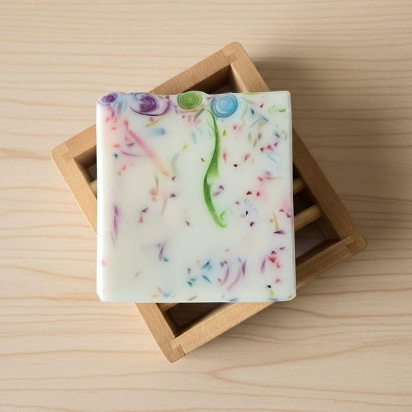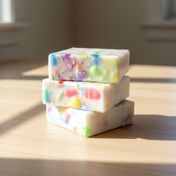 Scented with a tropical fusion a dragonfruit, peach, honeydew, white lily, and amber, Razzle Dazzle handcrafted soap contains shea butter and uses upcycled soap scraps to make a fun confetti design, giving you a one-of-a-kind soap bar.